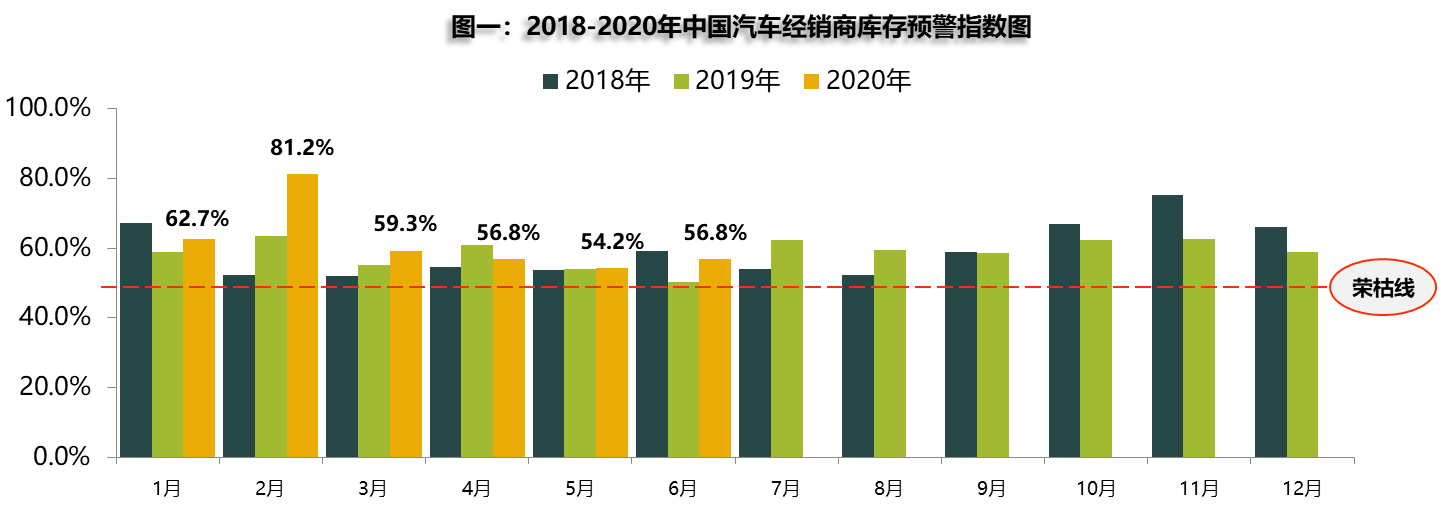 2020年6月30日,中国汽车流通协会发布的最新一期“中国汽车经销商库存预警指数调查”VIA(Vehicle Inventory Alert Index)显示,2020年6月汽车经销商库存预警指数为56.8%,较上月上升2.6个百分点,较去年同期上升6.4个百分点,库存预警指数位于荣枯线之上。