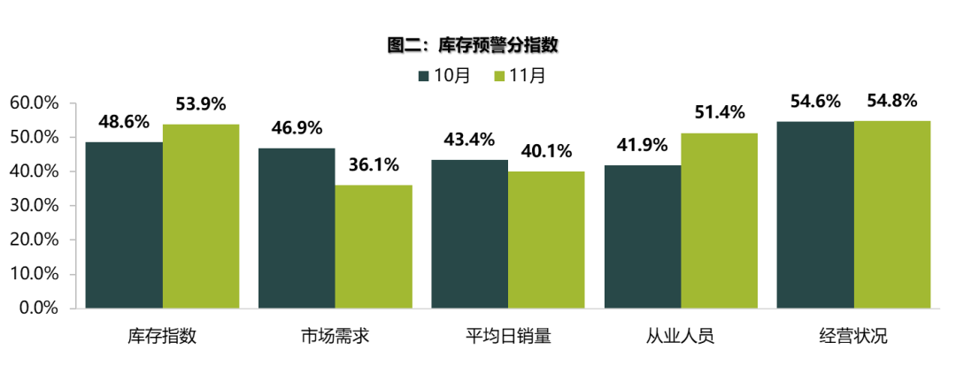 根据PMI编制的原理,库存预警指数采用扩展指数的编制方法,以50%作为荣枯线。50%以下均处于合理范围。库存预警指数越高,反应出市场的需求越低,库存压力越大,经营压力和风险越大。