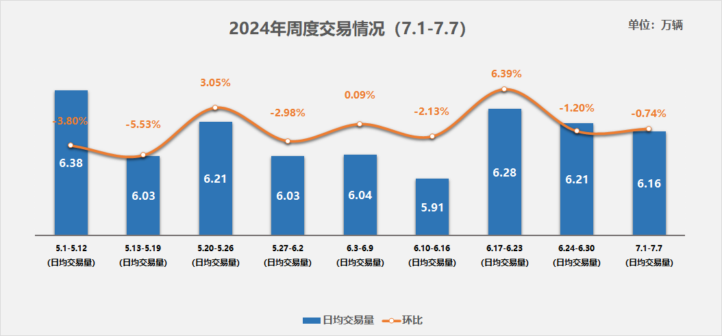 2024年7月1日至7月7日,二手车市场日均交易量达到6.16万辆,与上周相比下降了0.74%,但较6月的第一周增长了2%。这一数据表明,尽管市场交易量有所波动,但整体趋势仍显示出一定的增长潜力。