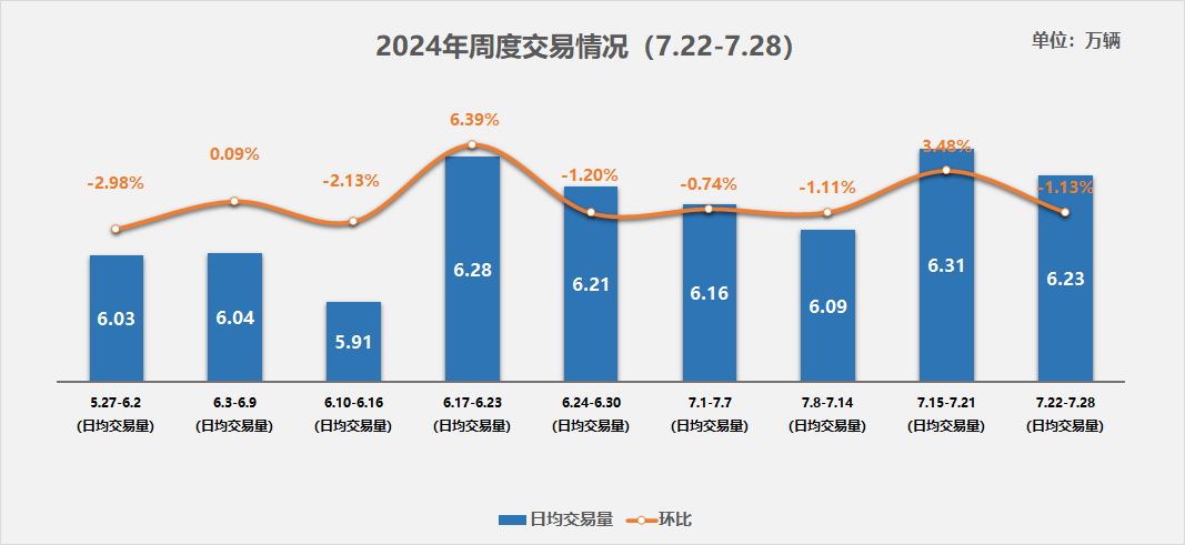 2024年7月22日至7月28日,二手车市场继续维持其稳定运行的态势,日均交易量达到6.23万辆,环比上周微降1.13%,显示出市场在小范围内的小幅波动。尽管环比略有下降,但与6月第四周相比,交易量实现了0.3%的微弱增长,增幅虽有所收窄,但整体市场仍处于合理波动区间内,季节性因素对市场的温和影响显而易见。