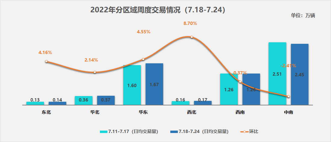 西南地区本周市场稳定,日均交易1.26万辆,四川地区的疫情反弹并未给西南地区造成明显影响。西北地区是本周日均0.17万辆,交易量小幅回升结合上周情况,7月总体降幅预计超过10%。