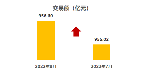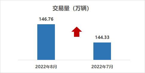 2022年8月,全国二手车市场交易量146.76万辆,交易量环比增长1.69%,同比下降2.04%,交易金额为956.6亿元。