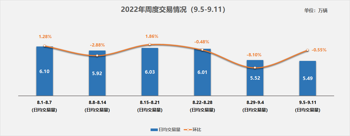 9月第一周日均交易量为5.49万辆,环比上周小幅下降0.5个百分点,与8月同期相比下降了7.26%。主要原因还是多地散发疫情的影响还未完全退去,因此交易规模跟上周基本持平。