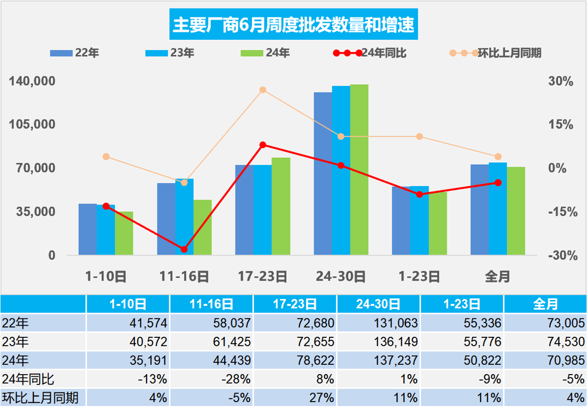 外部环境依然复杂严峻,内部需求短期不足。2023年非RDE处理带来增量,今年无政策及特殊情况影响波动,6月前两周的燃油车市场低迷,随着“6.18”的启动和乘用车市场进入半年收官期,各地方和车企努力冲刺销量业绩的意愿很强烈,厂商和经销商无论如何也要努力卷收官的销量。因此6月仍是销量走势较好的月份。
