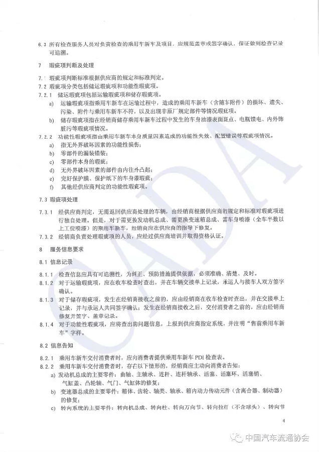 《指引》就范围、指引引用文件、术语缩略语和定义、服务项目、服务场所及设备要求、服务人员要求、瑕疵项判断及处理要求、服务信息要求以及服务信息管理要求等进行了明确规范,其中重点阐述了信息记录、信息告知的相关条款,对运输、存储、功能性瑕疵,全车主要零部件及修复率计算等作出了系统性描述。
