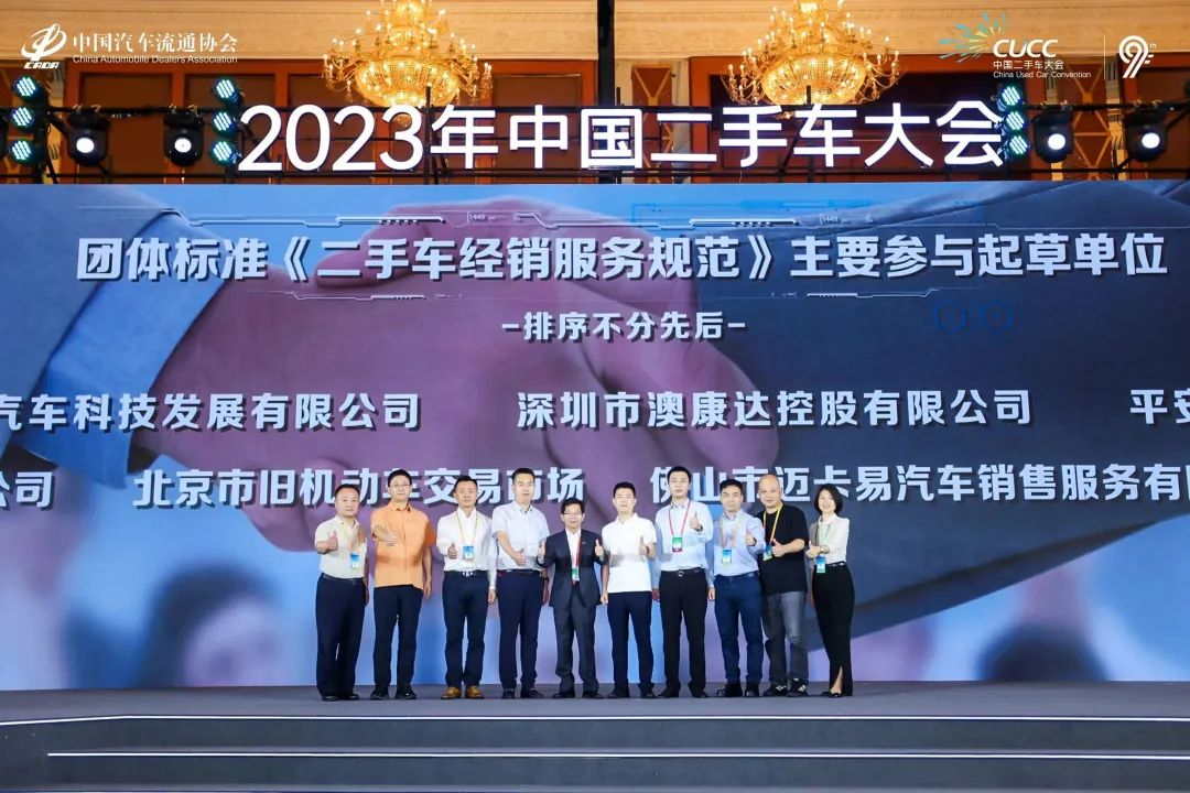 中国汽车流通协会组织行业力量共同研制了团体标准《二手车经销服务规范》,助力企业加速迈向规范化、连锁化、品牌化之路。大会现场,肖政三与青岛卡泰驰汽车科技发展有限公司、深圳市澳康达控股有限公司、平安银行股份有限公司汽车消费金融中心二手发展部、华奥安心技术服务(集团)股份有限公司、北京市旧机动车交易市场有限公司、佛山市迈卡易汽车销售服务有限公司、杭州百优卡网络科技有限公司7家参编单位代表,共同启动《二手车经销服务规范》发布仪式。