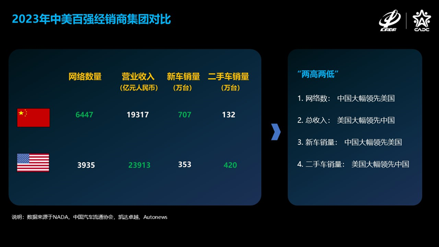 新车销量上:中国的百强集团新车销量707万台,而美国经销商百强的销量是353万台, 中国百强集团比美国百强集团多了350万台的新车销量