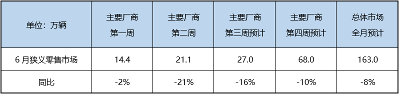 6月以来,厂家和经销商的促销活动持续加码,促进消费需求释放。据经销商调研,6月厂商目标同比下降3%,结合总体市场占比80%的调查样本,可以初步推出本月狭义乘用车零售市场大数在163万辆左右,同比下降约8%。调研显示,6月初展厅人气和成交相比上月有所回落,仅为去年同期的六成左右,终端市场面临一定的压力,主要厂商零售第一、二周同比分别下降2%、21%。随着月末的临近零售逐渐走强,第三周周度同比预计将有所提升,达到-16%左右。第四周受今年工作日较多的影响,日均同比预计接近-10%。全月零售走势呈现前低后高的特点,综合估算6月零售预计完成163万辆。