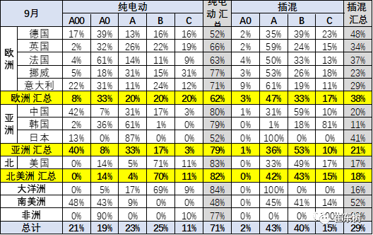 近几年的纯电占比持续提升,但2020年插混表现较强。世界新能源车的20年插混总销量占比是323%。而纯电动的占比达到68%。A级车的纯电动和插混都是主力车型。