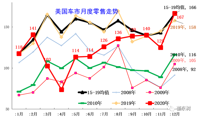 中国车市呈现年初年末相对较强、夏季走势相对偏软的情况。而美国车市呈现年初相对偏弱,年中相对平稳的特征。