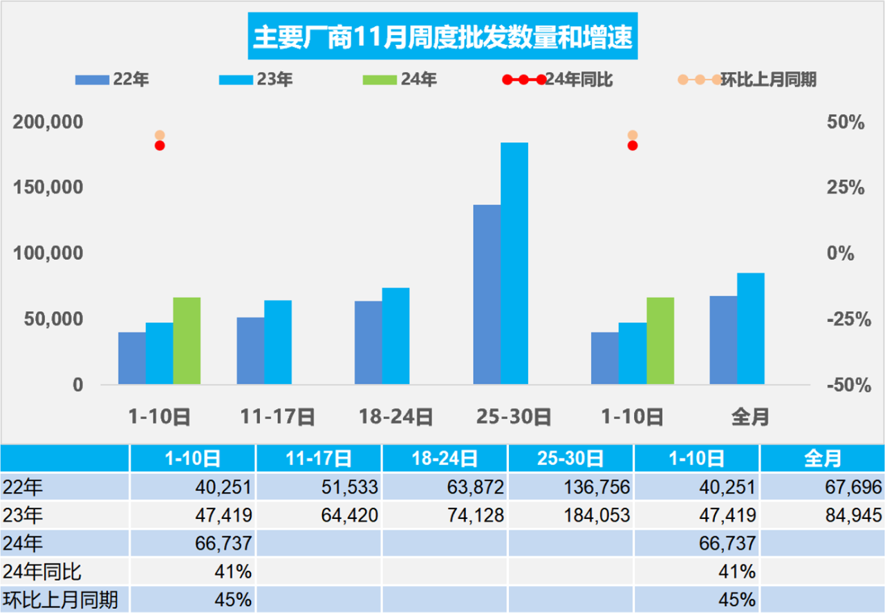 11月1-10日,全国乘用车厂商批发66.7万辆,同比去年11月同期增长41%,较上月同期增长45%;今年以来累计批发2,184.3万辆,同比增长5%。